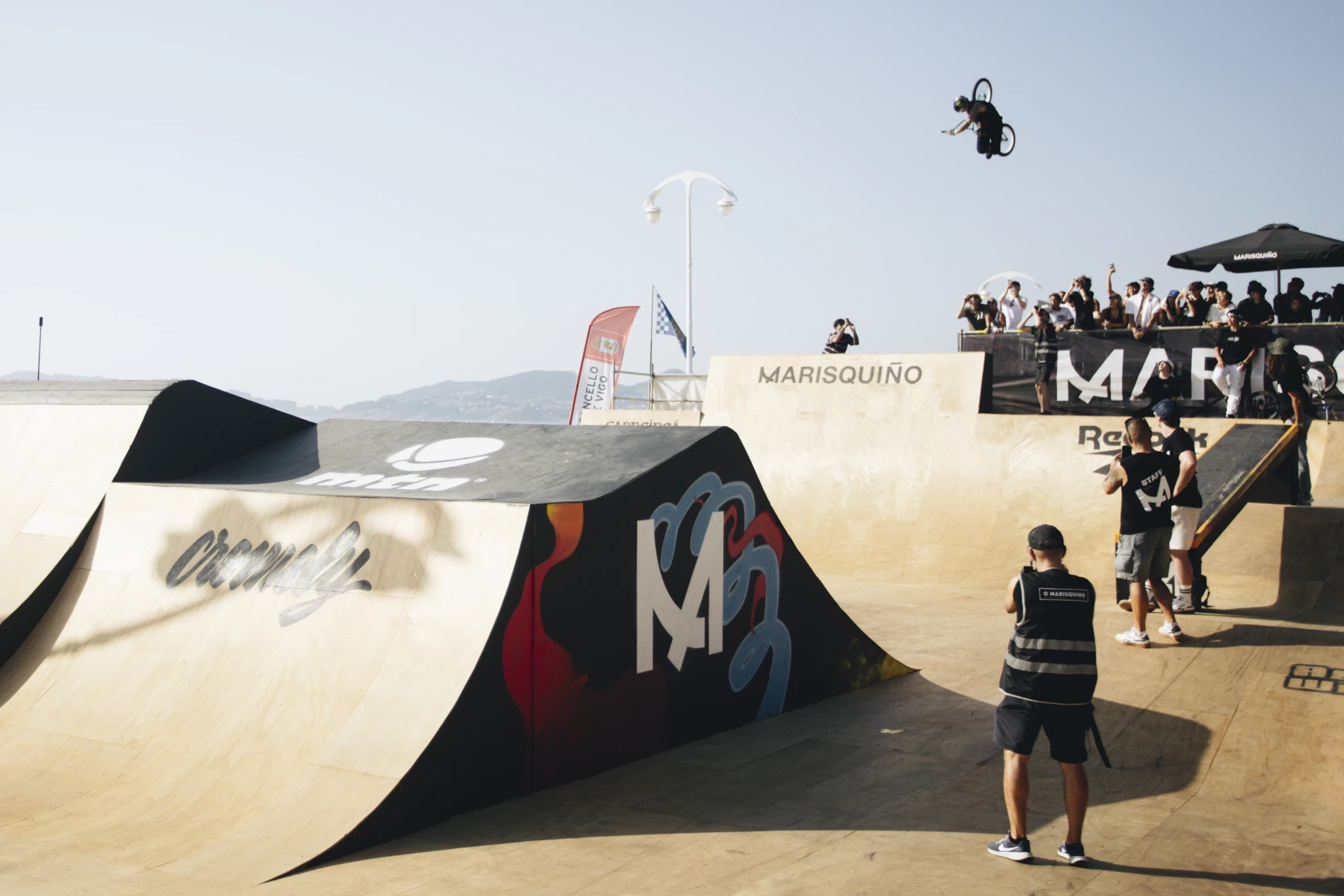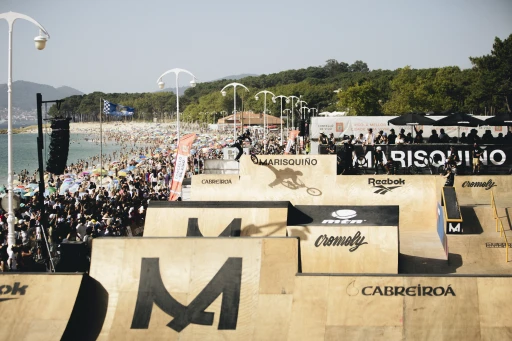Lino Escuris lleva fotografiando Marisquiño desde 2019 y no se cansa. Ni haciendo 93 kilómetros -eso dice su reloj- con la mochila en la espalda. “Las fotos son mejores a cada edición que pasa”, aseguraba el año pasado. Y tiene razón. Lo dice alguien que ha vivido la evolución del festival desde dentro, desde que empezó centrado en BMX —su especialidad— hasta atreverse hoy con todo lo que se le ponga por delante. Y sacar una galería como esta: